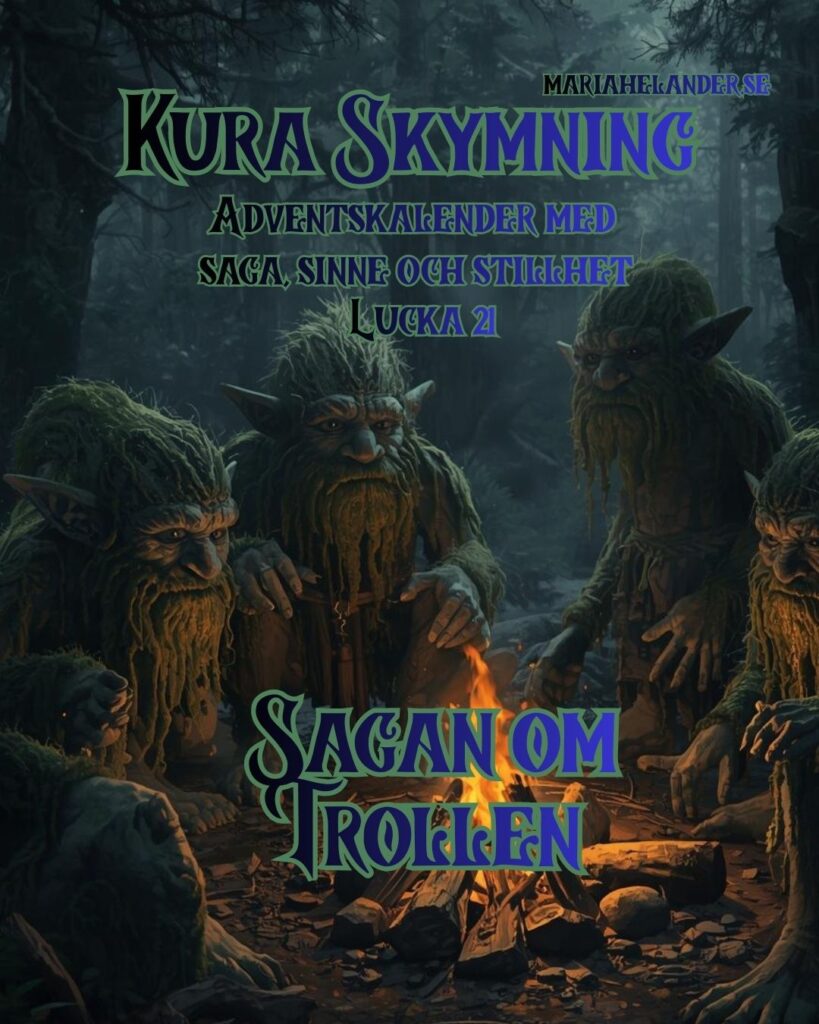 Så självklart ska vi möta trollen i vår adventskalender. Låt oss ta reda på om de verkligen är så farliga som myten vill få oss att tro. Och med denna saga vill jag önska dig ett fint vintersolstånd – eller midvinterblot som våra förlevande kallade denna högtid då vi upplever årets längsta natt. Just detta dygn kanske det finns störst möjlighet att få syn på ett troll – för nu sägs hinnan mellan världarna vara som tunnast och troll, knytt och andra heliga väsen busar lite extra. Glöm inte att ställa ut ett fat med mat åt de väsen som bor där du bor.